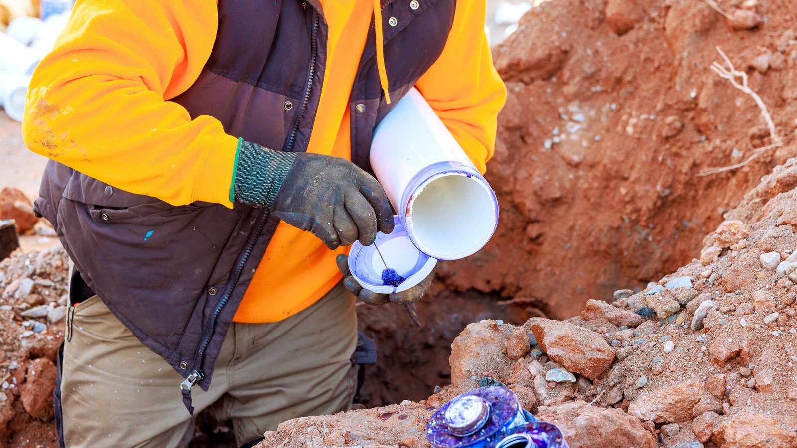 A Drain Bros llc worker installs part of a drainage system, showing safety and careful setup during utility work.